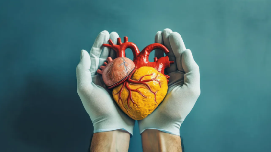 心脏外科医生持有逼真的患病心脏,心血管冠状动脉疾病意识,心脏健康心脏病专家概念。