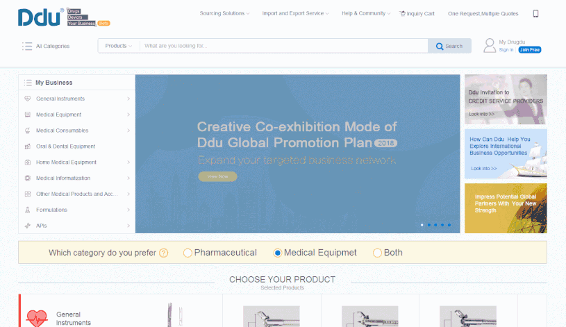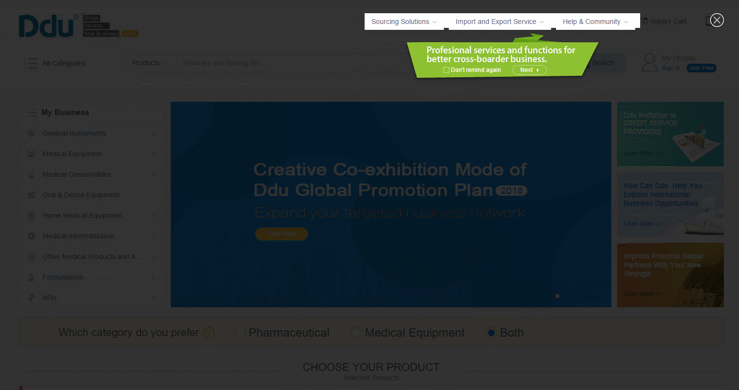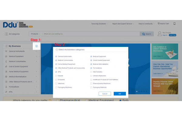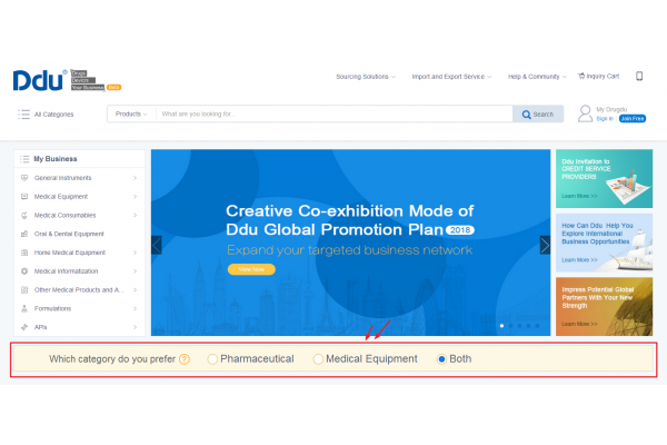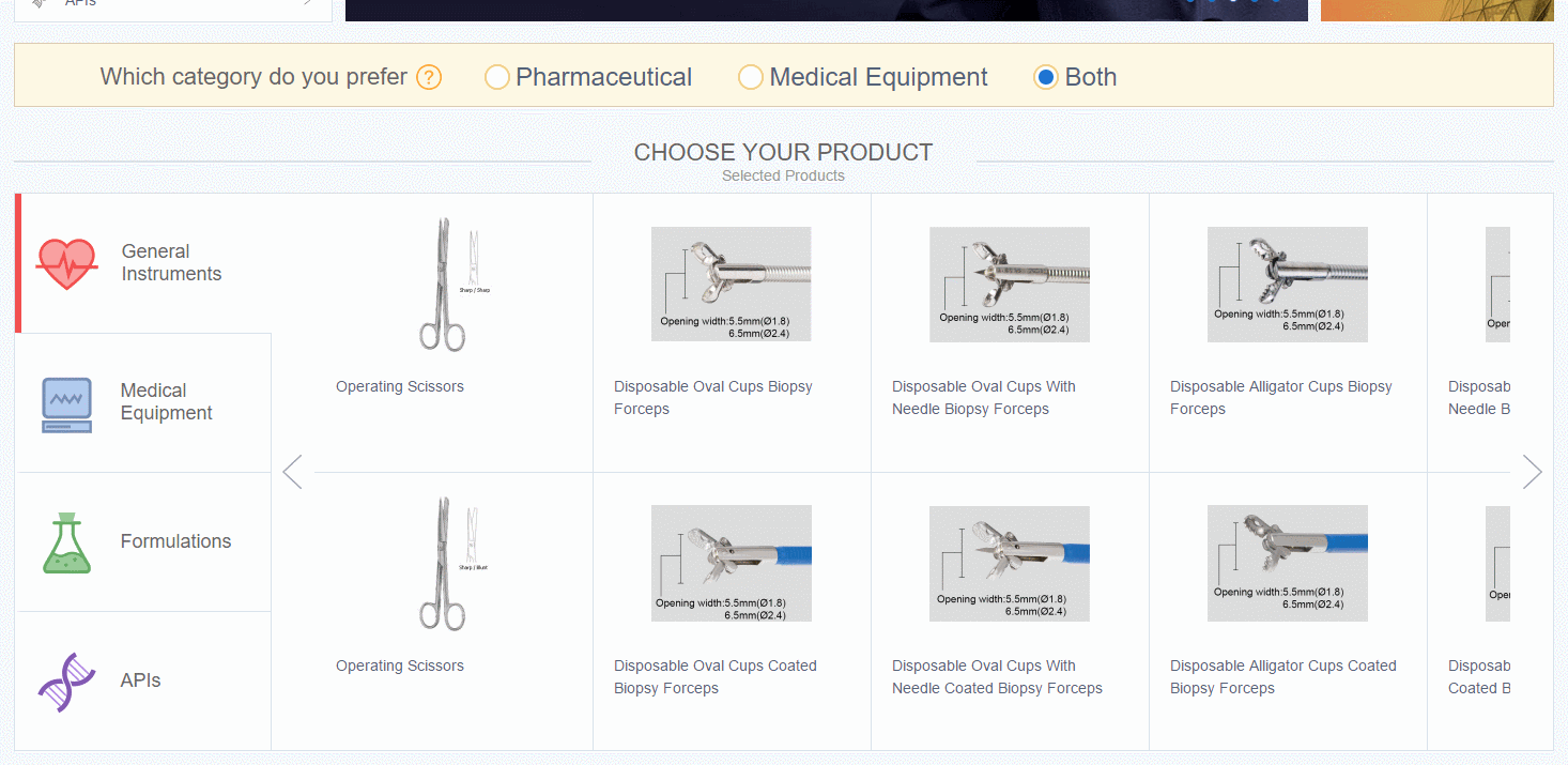 选择产品大类“pharmaceutical”或“medical equipment ”后,将会自动推荐您可能感兴趣的热门产品。