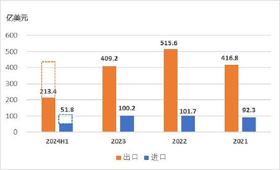 2024年上半年,我国原料药进出口总额265.2亿美元,同比增长0.6%。其中,出口额213.4亿美元,同比微增0.1%;进口额51.8亿美元,同比增长2.8%。