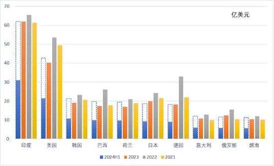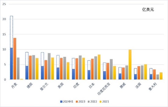 进口市场方面,丹麦市场异军突起,短短两年的时间即荣登我原料药第一大进口市场。2024年上半年,我从丹麦市场进口原料药10.5亿美元,同比增长96.3%,下半年有望继续冲刺,引领我国原料药进口。