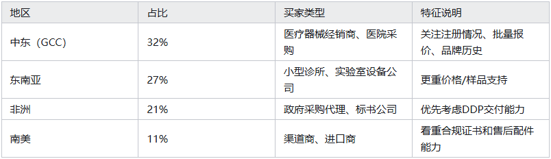 根据滴度医贸网平台数据,血液分析仪品类近3个月的有效询盘主要来自: