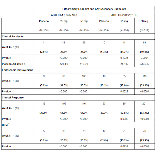abtect-2研究中,50mg组临床缓解率显著优于安慰剂组,分别为19.8%、6.3%。