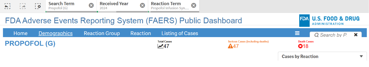 丙泊酚以其稳定的麻醉状态和快速恢复的特点广泛应用于麻醉领域。但其对循环系统的影响不可忽视[8,9];更重要的是长时持续输注可能引发致命的丙泊酚输注综合症(pris)[10,11,12]。fda数据显示[13],美国仅2024年发生的丙泊酚输注综合症就有47例,其中18例死亡,致死率超过38%(图1)。欧洲ema eudravigilance数据库显示,2024年6月6日至2024年10月20日的 4个半月左右时间,欧洲经济区(eea)范围内pris就新增13例,其中导致死亡6例[14],死亡率高达46%!