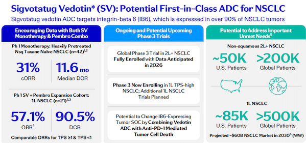 sigvotatug vedotin(sv)是辉瑞另一款重点推进的adc产品。该药是一款潜在“first-in-class”整合素β6靶向adc药物。该药通过对抗体的工程化改造让它对整合素β6(ib6)具有特异性,从而不与其他整合素结合,提高了该adc的肿瘤选择性。