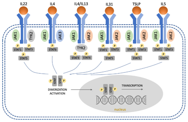 jak抑制剂靶向jak-stat(信号转导和转录激活因子)通路,该通路在许多免疫介导疾病(如ad)的发病机制中起重要作用。虽然针对ad的jak抑制剂对he的疗效尚未完全明确,但抑制th2通路可能对过敏性接触性皮炎有益,因为多种过敏原可引发th2偏向的免疫反应。
