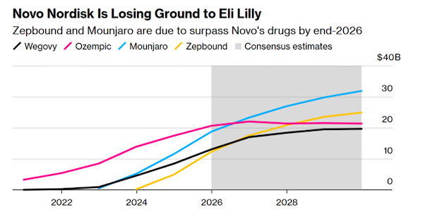 根据彭博社的预测,mounjaro和zepbound将在2026年全面超越ozempic与wegovy,并在接下来的三年显著拉大差距(图1)。