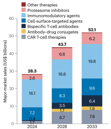 2024-2033年主要市场多发性骨髓瘤关键治疗药物的预测销售额