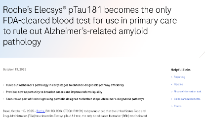 据悉,elecsys检测适用于55岁及以上,且出现认知衰退体征、症状或主诉的患者。通过测量血浆中的磷酸化tau(ptau)181蛋白水平,来辅助判断患者是否患有阿尔茨海默病。
