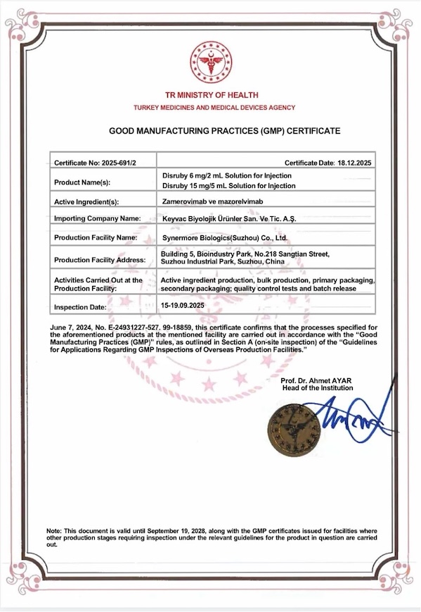 2025年12月31日,兴盟生物医药(苏州)有限公司(下称“兴盟生物”)宣布,公司已正式取得土耳其药品和医疗器械管理局(titck)颁发的药品生产质量管理规范(gmp)证书。此次认证不仅是兴盟生物获得的首张海外gmp证书,也标志着其自主研发的核心产品泽美洛韦玛佐瑞韦单抗注射液(商品名:克瑞毕®)的生产质量管理体系已达到国际标准,为该创新产品进军全球主流市场取得了关键资质。