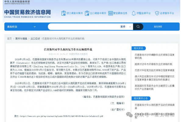 2026年1月14日,巴基斯坦国家关税委员会发布第adc68号案件的最新公告,对原产于或进口自中国的头孢羟氨苄(cefadroxil)作出反倾销肯定性终裁,决定对涉案产品征收反倾销税。
