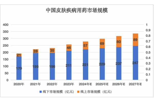 在行业增长的背景下,渠道结构正在发生深刻变化。2025年前三季度,我国三大终端六大市场中,零售药店终端成为销售额唯一呈正增长的板块,再度攀升31.5%。具体到皮肤用药领域,线上市场份额也在逐年扩大。