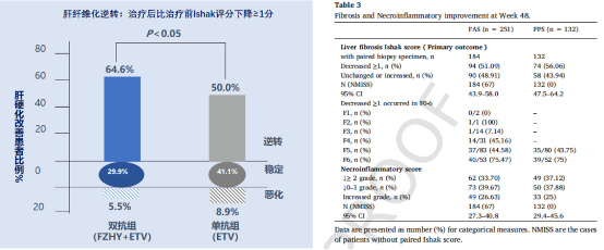 研究前后二次肝穿验证疗效,数据显示,乙肝肝硬化初治患者肝硬化逆转率64.6%,较恩替卡韦(etv)单用提高14.6%;hbv-dna阴性乙肝肝硬化经治患者加用扶正化瘀治疗,肝硬化逆转率56%,该逆转率较单用恩替卡韦抗病毒治疗的对照组提高了15%。研究发现乙肝肝硬化初治患者及hbv-dna转阴的经治患者,用扶正化瘀 恩替卡韦“双抗治疗”48周,均能有效逆转肝硬化,安全性良好。