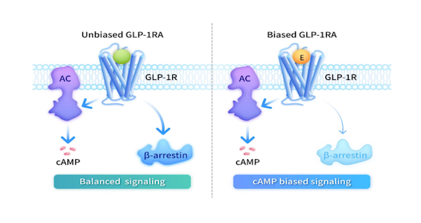 传统glp-1产品为“非偏向型”,激活有益的camp信号通路时会募集β-arrestin,导致受体脱敏、影响长期疗效;而埃诺格鲁肽通过精准分子设计,可选择性激活camp通路、最小化β-arrestin募集,维持持续治疗信号,其研发基于诺贝尔奖的gpcr研究所衍生的偏向激动理论/概念,科学意义显著。