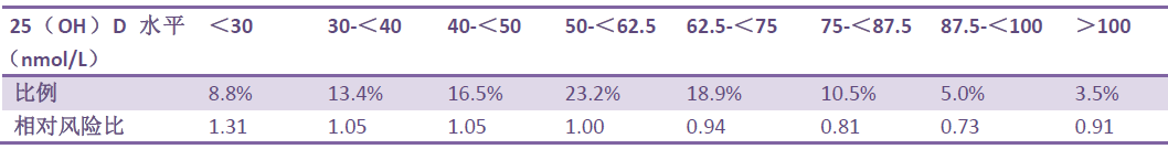 研究发现,<30nmol/l,维生素d明显缺乏的志愿者,患结直肠癌的风险会增加31%!神奇的是,当超过充足水平后,结直肠癌风险还有不小的下降,在75-<87.5nmol/l时,风险下降了19%,87.5-<100nmol/l时风险下降了27%!不过,值得注意的是,如果超过了100nmol/l,风险也不会持续下降了,反而还会反弹、升高一些。