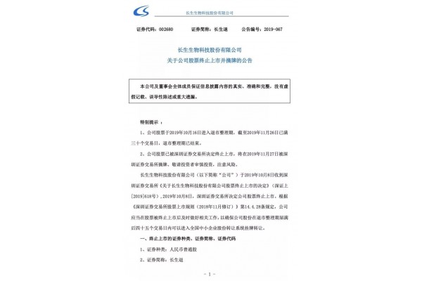 11月27日,长生生物发布公告称,公司股票已被深圳证券交易所决定终止上市,11月27日被深圳证券交易所摘牌。长生生物因重大违法强制退市第一股,被记录在a股的历史上。