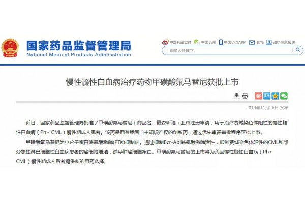 11 月 26 日,国家药监局宣布,已批准豪森的 1 类新药甲磺酸氟马替尼(商品名:豪森昕福)上市注册申请,用于治疗费城染色体阳性的慢性髓性白血病(ph cml)慢性期成人患者。