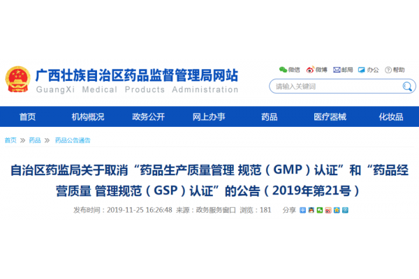 11月25日,广西药监局发布公告,取消“药品生产质量管理 规范(gmp)认证”和“药品经营质量 管理规范(gsp)认证”。