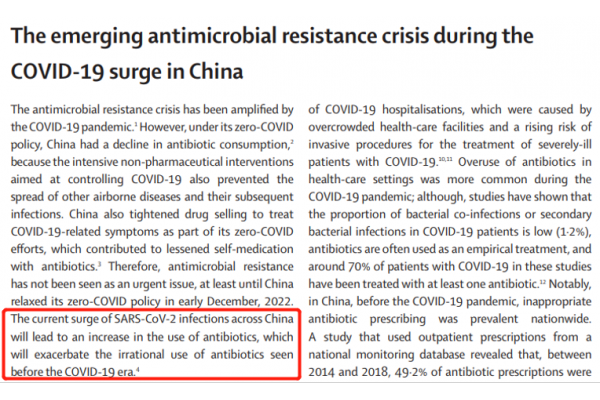 2 月 10 日,the lancet 刚刚刊登了一篇中国发展研究基金会所撰文章,提示防控措施调整后,短时间内新冠患者的激增,让我国抗生素的不合理使用很快回到疫情之前,甚至更加严峻 [4]。