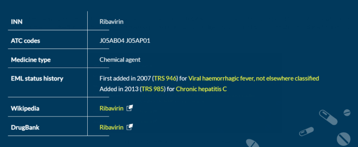利巴韦林用药信息 图源:who 基本药物标准清单电子版