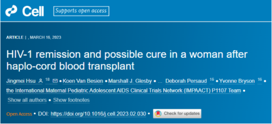 2023年3月17日,美国威尔康奈尔医学院的研究人员在cell期刊上发表了一篇题为"hiv-1 remission and possible cure in a woman after haplo-cord blood transplant"的研究论文。