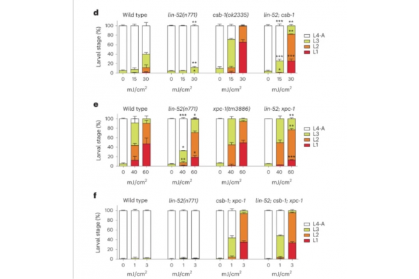 为了评估转录抑制复合物基因的突变是否会影响dna损伤引发的生物体衰老,研究团队在转录抑制复合物突变蠕虫到成年期的第一天进行了紫外线处理,并评估了它们的寿命。