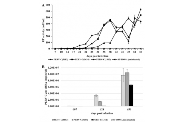 接下来研究人员对perv-c(561)的复制和感染能力进行了检测,并与已被鉴定具有复制能力的perv-c(1312)进行比较。将perv-c(5634)和perv-c(5683)前病毒转染st-iowa细胞,在转染后9天检测到病毒逆转录酶(rt)活性,比perv-c(1312)早4天,转染两周perv-c(5634)达到最大值210 mu/ml, perv-c(5683)达到最大值 256 mu/ml,比阳性对照perv-c(1312)高5-10倍。在观察期结束时,perv-c克隆的rt活性均在100至200 mu/ml范围内,表明其可以在细胞培养中稳定繁殖。