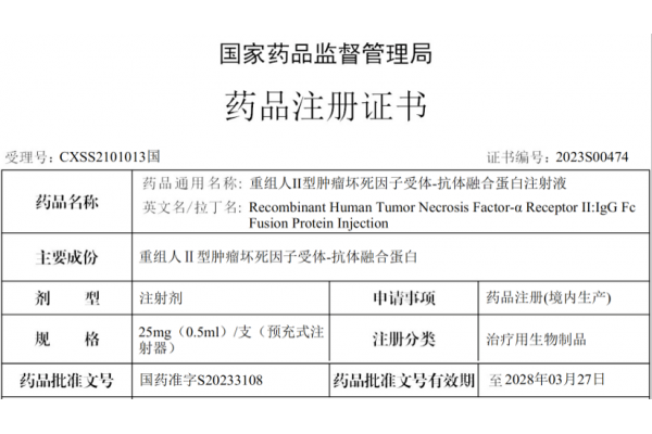 近日,三生国健宣布,益赛普®(重组人ii型肿瘤坏死因子受体-抗体融合蛋白注射液)预充针剂型今日正式获得国家药品监督管理局(nmpa)的上市批准,适应症为:(1)中度及重度活动性类风湿关节炎(2)18岁及18岁以上成人中度及重度斑块状银屑病(3)活动性强直性脊柱炎。