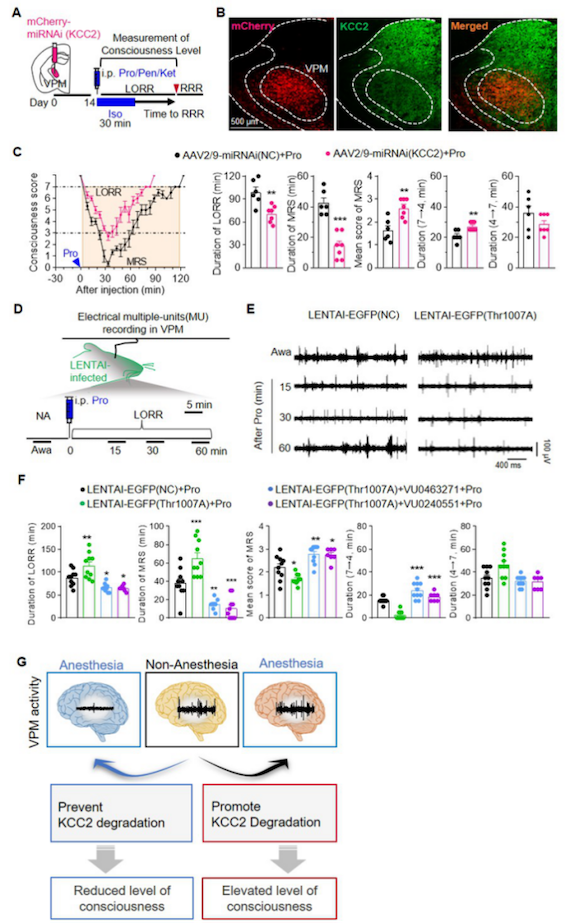 敲除丘脑vpm核团中的kcc2可以抑制麻醉作用而加速意识恢复;阻止kcc2的泛素降解则可以加强麻醉作用而延缓vpm神经元兴奋性恢复和意识复苏