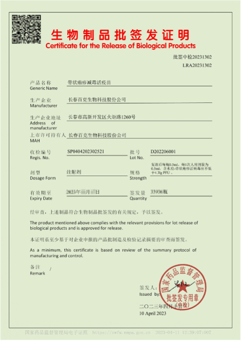 从有关渠道获悉,2023年4月10日,长春百克生物科技股份公司研发生产的带状疱疹减毒活疫苗(商品名:感维®)获得国家药品监督管理局《生物制品批签发证明》。该产品于2023年1月末获得国家药品监督管理局的《药品注册证书》,在本次获得首次批签发以后,标志着国产首个带状疱疹疫苗产品在国内上市并随着全国各省的招标进度,陆续在全国各地供应。