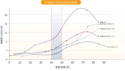 随着中国人口老龄化愈发严重,中国带状疱疹发病率急剧上升。我国带状疱疹发病率目前是12.6/1000人年,每年带状疱疹的发病人数为266万,而且呈现出年轻化趋势。亚太地区20年回顾数据显示,40岁以上人群带状疱疹的发病率上升趋势明显。