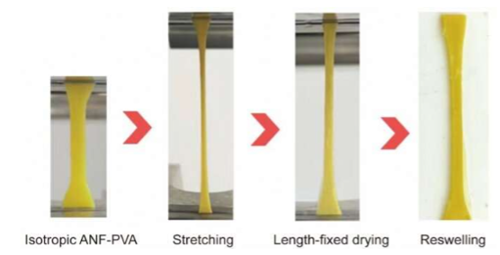 在这项研究中,将源自kevlar(一种用于防弹背心和头盔的聚合物材料)的芳纶纳米纤维与另一种合成聚合物聚乙烯醇混合,用于构建肌腱模拟水凝胶。在制造过程中施加拉伸应力,芳纶纳米纤维根据拉伸方向相互对齐,从而形成模仿天然肌腱结构特征的各向异性网络。