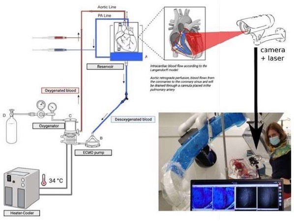 为了测试这种方法,研究人员开发了一个临床模型来研究移植前供体心脏的冠状动脉循环。然后,他们使用激光和安装在固定在灌注模块上方的关节臂上的相机来生成和分析快速变化的散斑图案,灌注模块包含供体心脏。