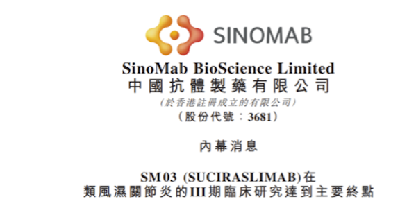 2023年4月26日,中国抗体制药(03681)宣布,其旗舰产品sm03舒西利单抗(suciraslimab)在中国开展的治疗类风湿关节炎(ra)的iii期确证性临床研究(试验方案编号:sm03-ra-iii)已完成揭盲及初步统计分析,试验达到主要研究终点,标志着suciraslimab距离商业化上市又迈进一大步。