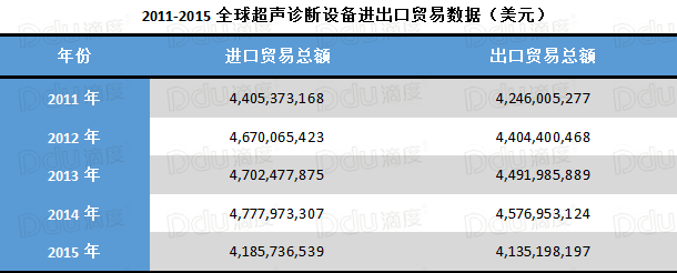 据统计,2015年全球超声诊断设备进出口贸易总额为83.21亿美元,较上年同期下降11.05%。其中,进口贸易总额为41.86亿美元,同比下降12.40%;出口贸易总金额为41.35亿美元,较上年同期下降9.65%。