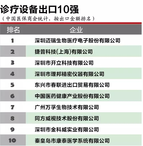 根据我国海关数据统计,2016年我国诊疗设备贸易总额为223.8亿美元,同比微涨1.2%,出口额为90.3亿美元。其中,心脏起搏器、医疗车、肾脏透析等设备出口同比增长超过30%。主要产品出口企业名单如下: