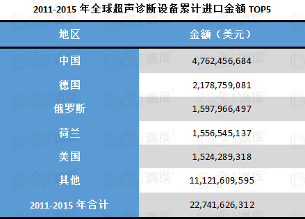 2011年以来,全球超声诊断设备进口贸易总额高达227.42亿美元。2011-2015年间,我国超声诊断设备进口总金额为47.62亿美元,位居榜首,德国累计进口金额为21.79亿美元,俄罗斯累计进口金额为15.98亿美元。