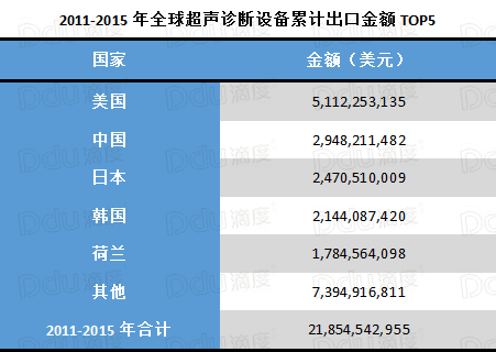 2011年以来,全球超声诊断设备出口贸易总额达到218.55亿美元。在2011-2015年间,美国超声诊断设备出口总金额为51.12亿美元,位居第一;我国累计出口金额为29.48亿美元,位居第二。