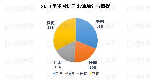 2011年,我国进口了来自88个国家和地区的诊断设备,进口额排在前三位的分别是美国、德国和日本,其合计占比达67.43%。