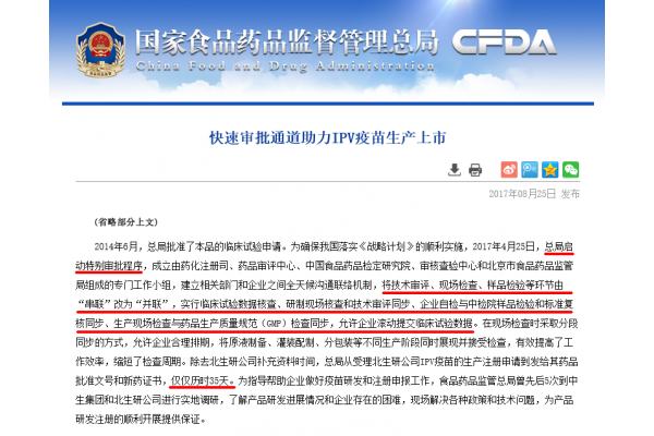 除去北生研补充资料时间,总局从受理ipv疫苗生产、注册、申请到颁发药品批准文号和新药证书,仅仅历时35天。