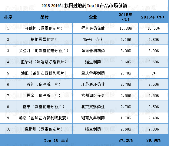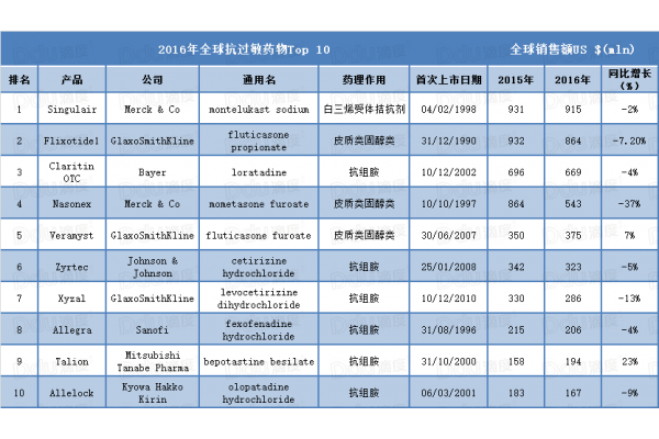 2016年evaluatepharm数据显示,全球抗过敏药top 10近有八成产品的销售额处于增长停滞或下滑,尚无一款抗过敏药销售额过10亿美元。