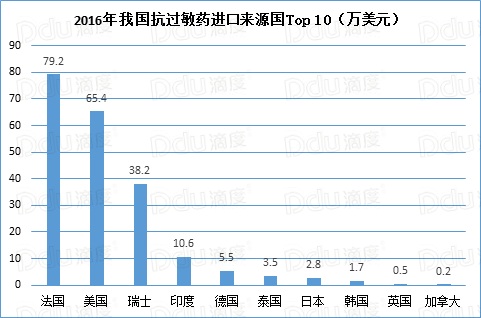 根据我国海关数据统计,2016年我国抗过敏药主要进口来源国分别为法国、美国和瑞士等国家,其中我国抗过敏药top 10进口来源国的进口总额如下表: