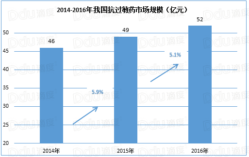 据pdb(药物综合数据库)数据显示,2016年我国抗过敏药总体规模为52亿元,较2015年增长5.1%。