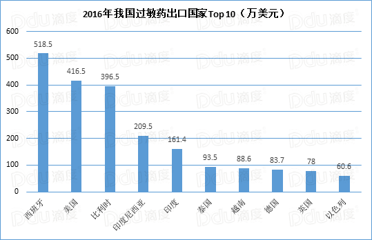 根据我国海关数据统计,2016年我国抗过敏药主要出口到西班牙、美国、比利时等国家,其中出口top 10 国家出口总额达2106.8万美元: