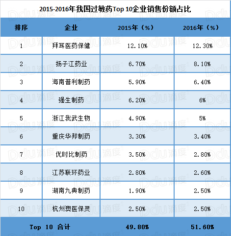 其中,2016年抗过敏药市场前十企业以内资企业为主,占市场总额51.6%,市场集中度高。