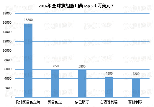 2016年抗组胺用药top 5分别是枸地氯雷他定、氯雷他定、依巴斯汀、左西替利嗪、西替利嗪。