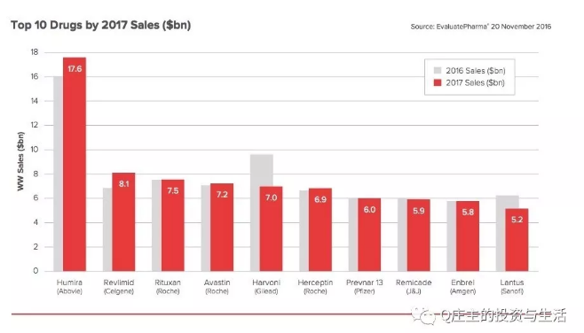 第十名lantus,中文名来得时,甘精胰岛素。前面六大生物药一半是罗氏的肿瘤药,一半是tnf抗体治疗免疫的,但都是单克隆抗体药。lantus不是单克隆抗体,是治疗糖尿病的生物药。lantus在大多数国家的专利于2016年左右到期,礼来已经瞄上了这个市场,预计2020年能为礼来带来6.3亿美金收入。