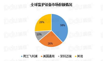从品牌方面看,目前全球医疗监护仪重点品牌主要有荷兰飞利浦(philips)、美国通用(ge)和深圳迈瑞生物医疗电子股份有限公司(mindray),市场份额分别为38%、26%、10%,市场出现寡头垄断格局。