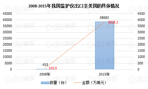 而且,美国也是我国病人监护仪出口最大市场,尤其是2008年-2015年间出口增幅明显,出口数量在8年间增长了84.4倍,出口金额增长了36倍。