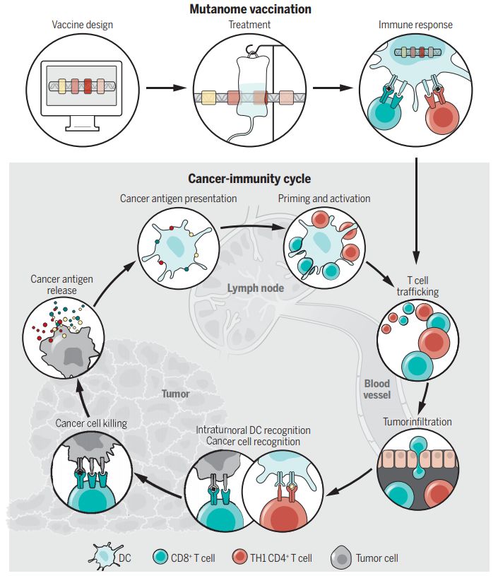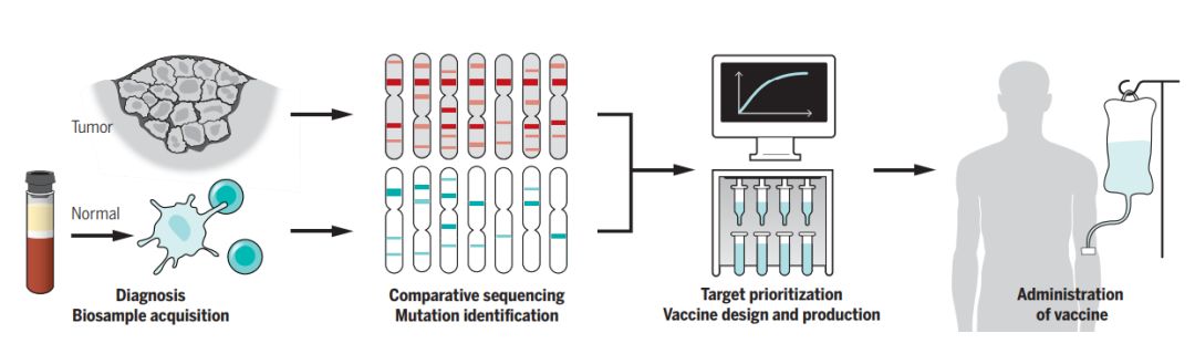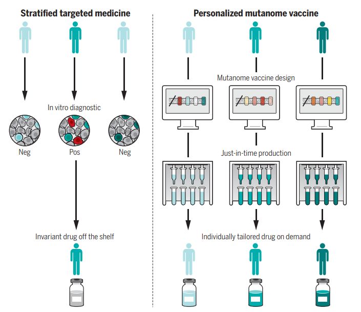 众所周知,癌症的一大特点,便是遗传变异的大量积累。随着突变一个接一个的出现,人体内会出现癌症特异性的新抗原表位,它们也是癌症疫苗的理想靶点。随着基因组学、数据科学、以及癌症免疫疗法的进步,现在我们已经能快速地在基因组里寻找到突变,并合理地选择出适用于疫苗开发的靶点,按需生产出针对特定患者的个体化疫苗。在人体中的临床试验也表明,此类癌症疫苗安全有效,能针对个体肿瘤突变产生免疫应答。