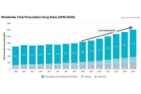 evaluatepharma近日在bio2018发布的报告《world preview 2018, outlook to 2024》指出:2024年全球处方药销售额将达到1.2万亿美元。